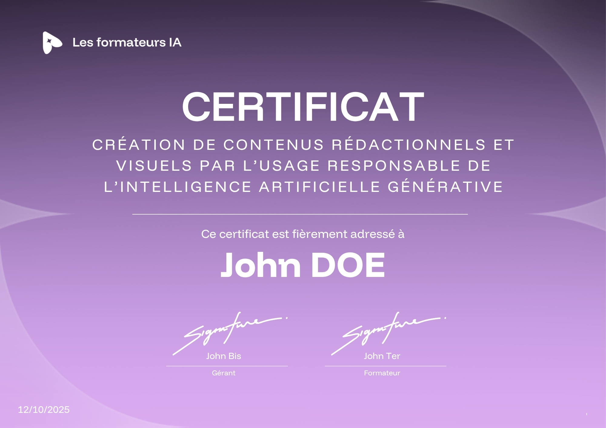 À l’issue de la formation, vous obtiendrez une certification officielle reconnue par l’État, gage de vos compétences en IA responsable.